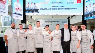 Nine contestants competed in the seventh edition of the Superyacht Chef Competition, organized by Yacht Club de Monaco’s La Belle Classe Academy training center in partnership with Bluewater. Chef Aaron Thomas of 33-meter Canvas earned the coveted prize with a lobster dish in two parts — a plate accompanied by asparagus and a morel fricassee followed by a bisque.